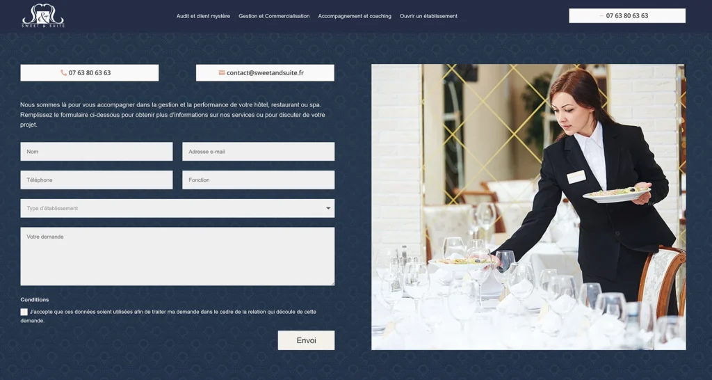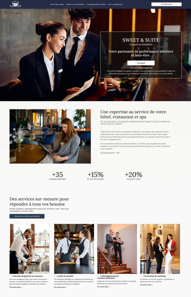 Chaque page est pensée pour convaincre et rassurer, tout en positionnant Sweet & Suite comme un pilier du conseil hôtelier à Paris et en régions.